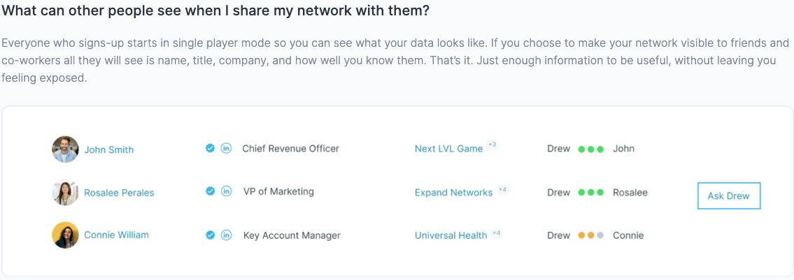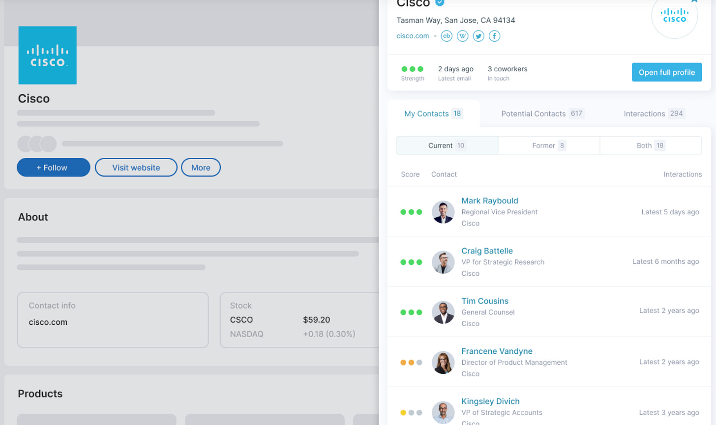 So there is a company called Connect the Dots that has recently raised a $15 million Series A round. The company solves the introductions problem of LinkedIn. Connect the Dots uses data from your emails to put together a dashboard of how strong your connections are.